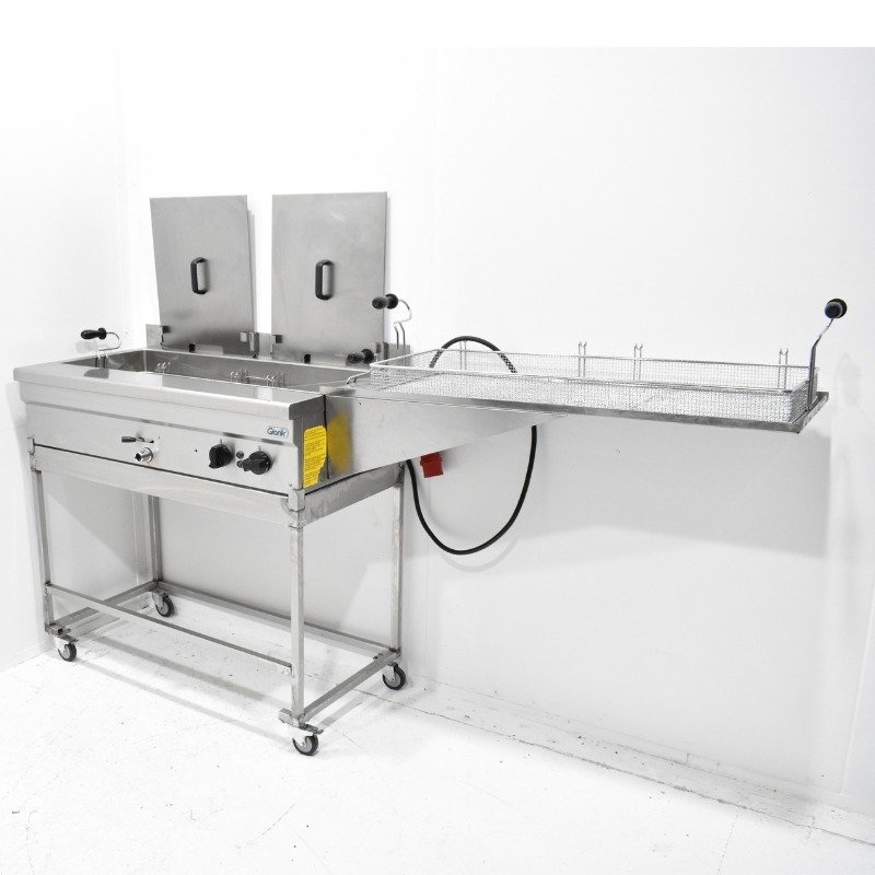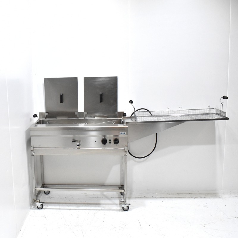 Oliebollen friteuse van het merk Giorik. Voorzien van 2 manden, een afdruiprek en deksel (het afdruiprek kan ook op de linkerzijde worden geplaatst).