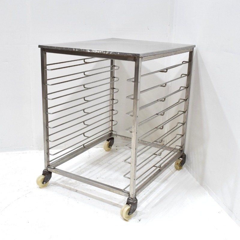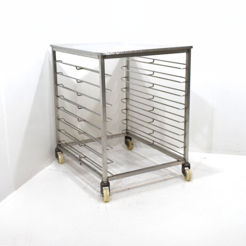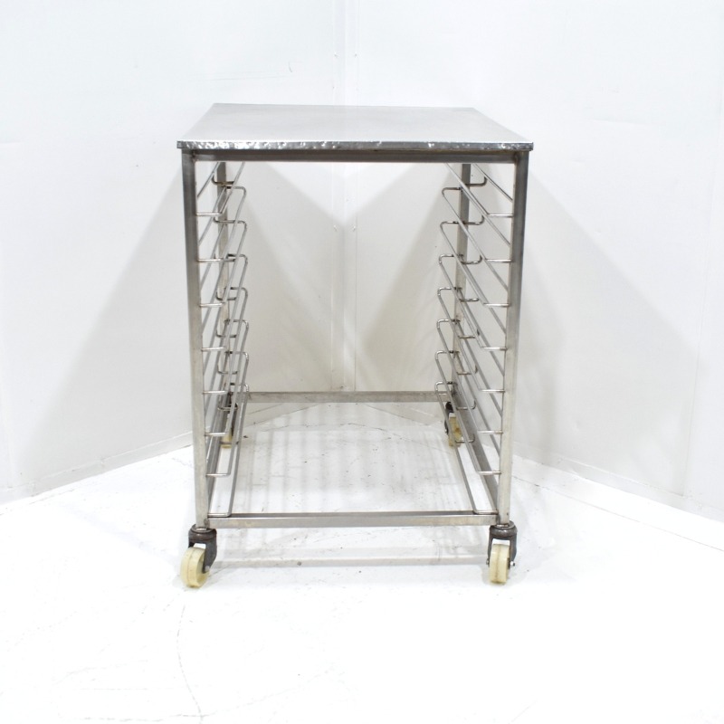Deze tafel is ideaal als extra werkoppervlak of voor het opslaan en transporteren van platen binnen de bakkerij.