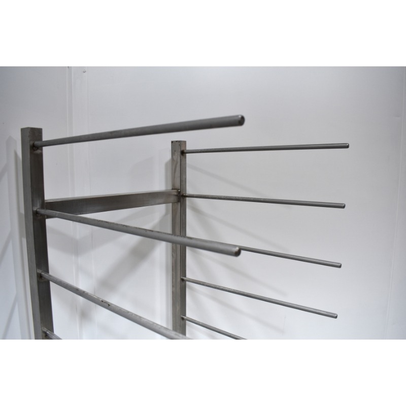 Deze compacte RVS pennenwagen (ook te gebruiken als platenwagen) heeft 11 etages met een tussenruimte van 12 cm, ideaal voor het opslaan of transporteren van bakplaten of bakwerk. De wagen is uitgevoerd in duurzaam roestvast staal en voorzien van 4 zwenkwielen, waardoor hij eenvoudig te verplaatsen is.