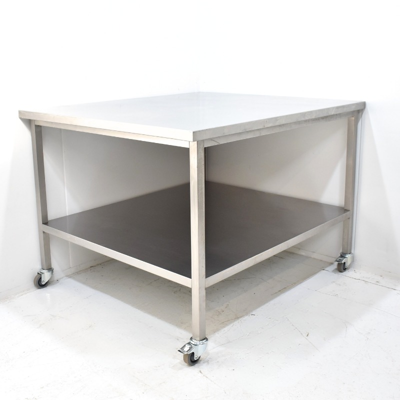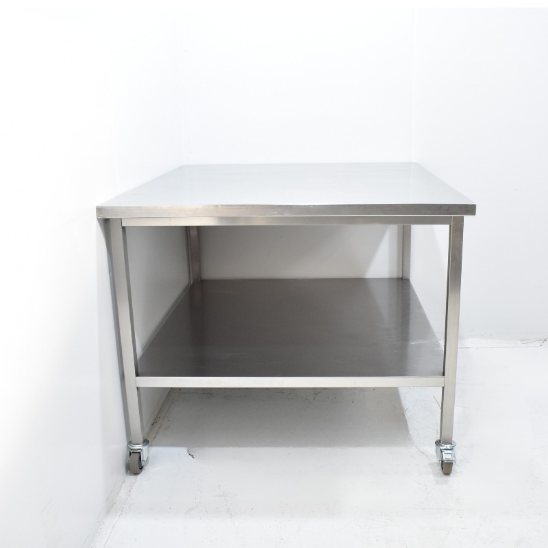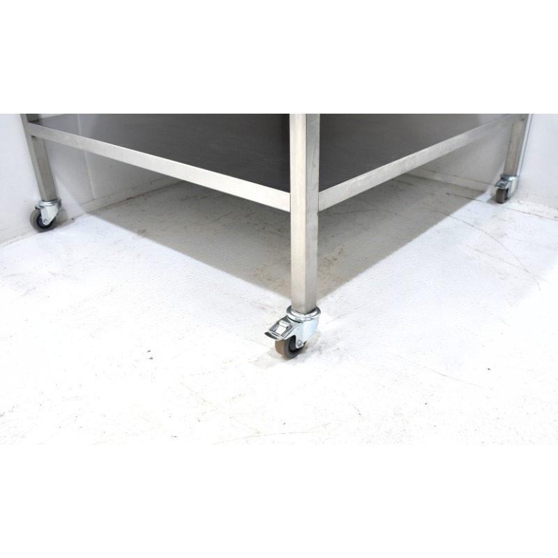 Degelijke RVS werkbank, geschikt voor intensief gebruik in bakkerijen, keukens of productieruimtes. Voorzien van een stevig onderschap voor extra opbergruimte en uitgerust met vier zwenkwielen, waarvan twee met rem, voor optimale mobiliteit en stabiliteit.
