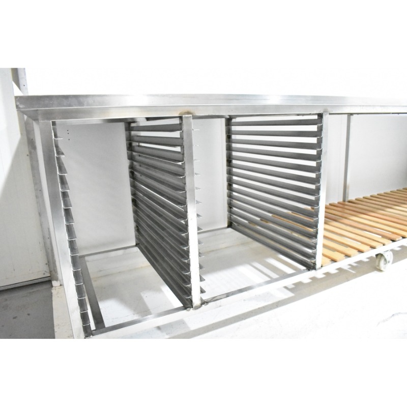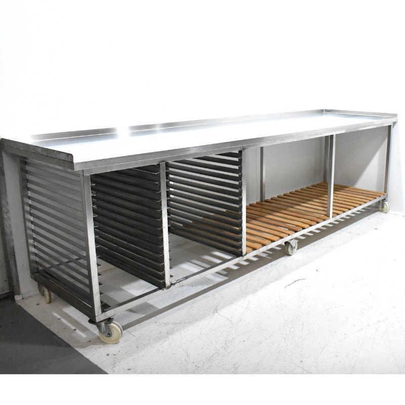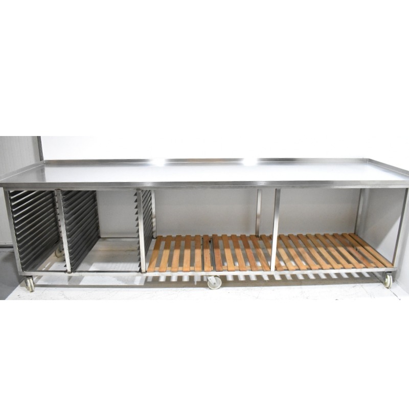 Zeer complete en grote occasion werkbank, ideaal voor gebruik in de bakkerij of productieruimte. Voorzien van geïntegreerde platenrekken en ruime opbergmogelijkheden, waardoor je efficiënt kunt werken.